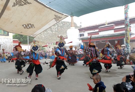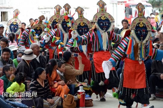 8月6日,在西藏堆龍德慶縣乃瓊鎮(zhèn)甲熱村,覺木隆藏戲團(tuán)的演員們在村里的雪頓節(jié)慶典上表演。