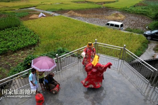 國家旅游地理 廣西河池8月19日訊 8月18日,譚圣慈老人(左一)帶著前來學(xué)習(xí)的兩名男孩跳儺面舞。在廣西北部與貴州交界一帶的我國唯一的毛南族自治縣——環(huán)江毛南族自治縣,神秘的儺戲被譽(yù)為毛南族的“族寶”。原始古樸、風(fēng)格獨(dú)特的儺戲是毛南族的民間傳統(tǒng)舞蹈,藝人在表演過程中經(jīng)常戴著被稱為儺面的木制面具。儺面一般高30厘米、寬20厘米,由毛南族藝人在民族口頭文學(xué)的基礎(chǔ)上依據(jù)個(gè)人想象創(chuàng)作,用優(yōu)質(zhì)木塊雕琢而成,共有文、武、善、兇四大類72種面相。