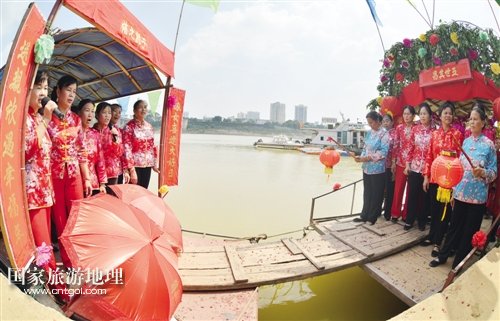 國(guó)家旅游地理 廣西南寧10月3日訊(記者 龍博 實(shí)習(xí)生 雷麗軍/文 記者 段柳健/圖) 金秋十月的邕江河畔,秋高氣爽,碧水粼粼。昨日,從南寧港的江邊傳來(lái)陣陣漁歌與歡喜的嗩吶聲,原來(lái),水上人家周木蘭家在這一天嫁女,一場(chǎng)古樸而傳統(tǒng)的水上婚禮儀式正在邕江岸邊拉開(kāi)序幕。隨著水上人家的上岸,這樣的傳統(tǒng)婚俗儀式越來(lái)越少見(jiàn),而獨(dú)特且略顯神秘的婚俗也吸引了四面八方過(guò)來(lái)湊熱鬧的人們。