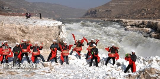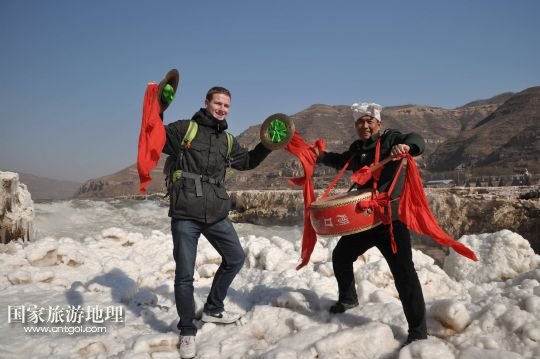 國(guó)家旅游地理 陜西延安1月26日訊 1月25日,一名游客在黃河壺口瀑布景區(qū)與民俗演員合影留念。當(dāng)日,受凌汛影響一度關(guān)閉的黃河壺口瀑布景區(qū)重新開(kāi)放迎賓,游客可近距離欣賞“冰瀑玉壺”的壯麗景觀。 /新華社發(fā)(呂桂明 攝)