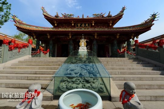 這是臺(tái)兒莊古城在原址復(fù)建的媽祖廟(4月7日攝)。作為京杭運(yùn)河上重要的水旱碼頭之一,臺(tái)兒莊的建筑融合了多種文化元素。