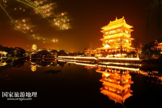 國家旅游地理 山東棗莊4月22日訊 這是夜色下的臺(tái)兒莊古城復(fù)興樓(4月8日攝)。1938年春的臺(tái)兒莊大戰(zhàn),是抗日戰(zhàn)爭(zhēng)爆發(fā)后中國軍隊(duì)在正面戰(zhàn)場(chǎng)取得的一次重大勝利。臺(tái)兒莊是世界著名的二戰(zhàn)紀(jì)念城市,有著2000多年歷史的臺(tái)兒莊古城完好地保存著53處戰(zhàn)爭(zhēng)遺跡。