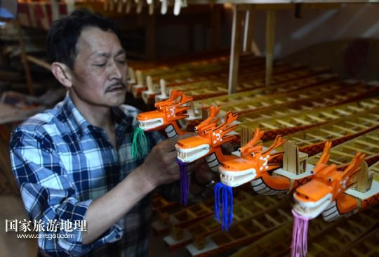 國家旅游地理 湖北宜昌5月15人訊 5月15日,手工藝人鄭祥龍在為微型龍舟上龍頭。端午節(jié)臨近,屈原故里湖北省秭歸縣歸州鎮(zhèn)手工藝人鄭祥龍精心制作一條條微型木制龍舟,準備在端午文化節(jié)期間向中外游客進行展示。