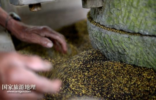 6月21日,在湖北省宣恩縣箭竹坪村的榨油房里,“打榨佬”用石磨將炒熟的菜籽磨碎。