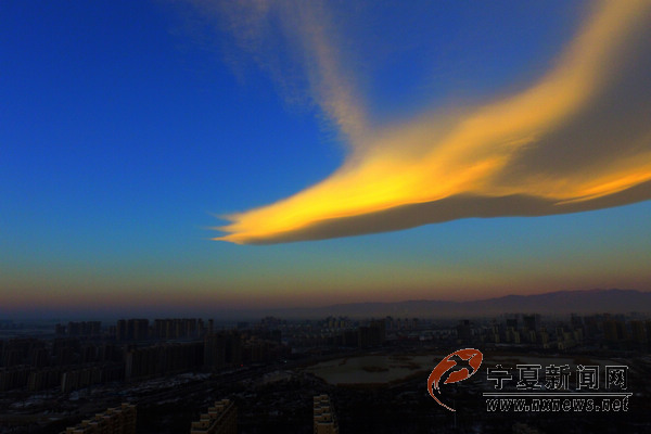 12月26日8時(shí)10分許,銀川上空出現(xiàn)奇云,宛如一只展翅飛翔的鳳凰浮于銀川西邊天空,伴著初升的朝陽(yáng)與巍峨的賀蘭山為伴,格外美麗。 寧夏新聞網(wǎng)記者 祁瀛濤 攝